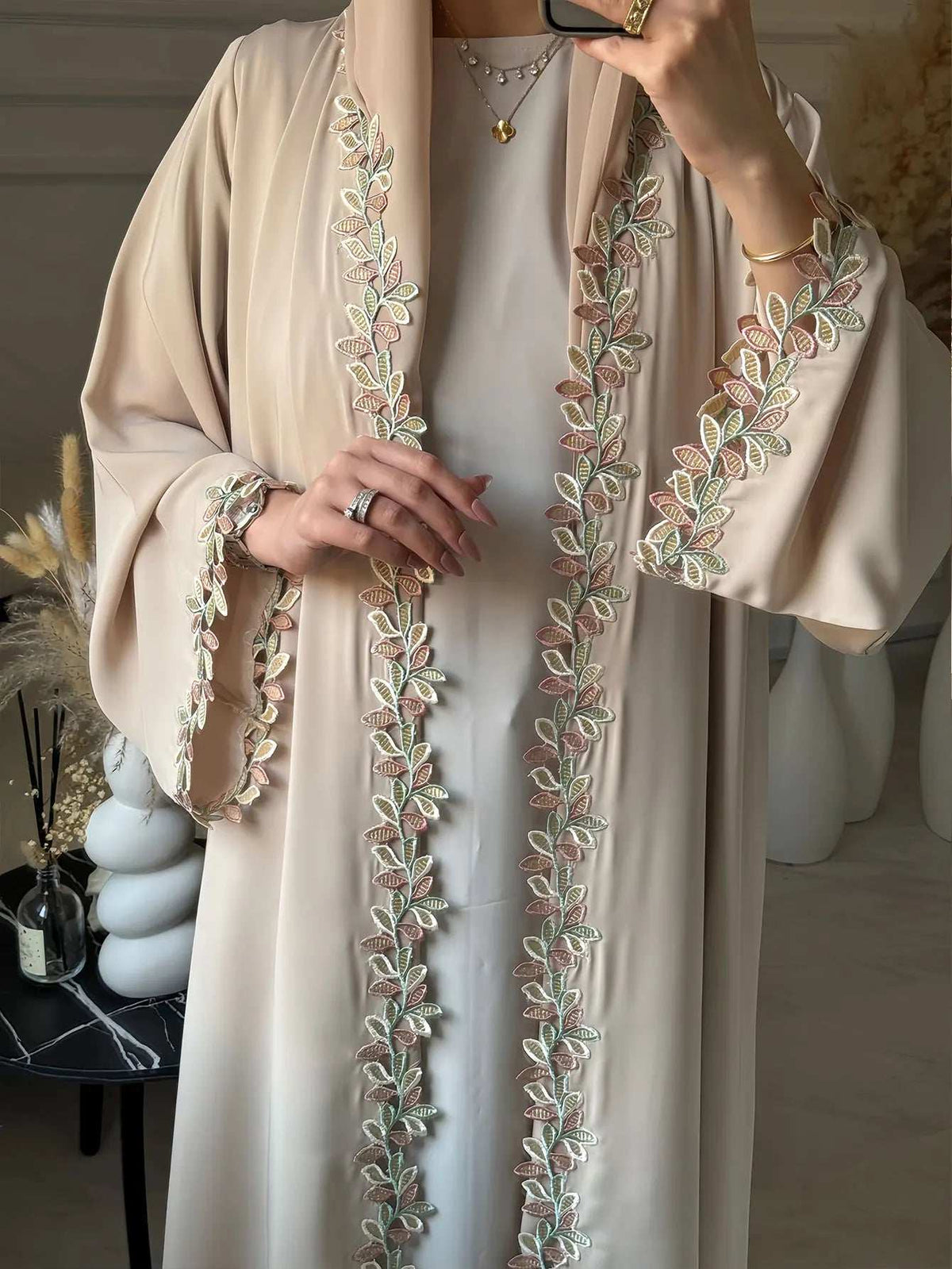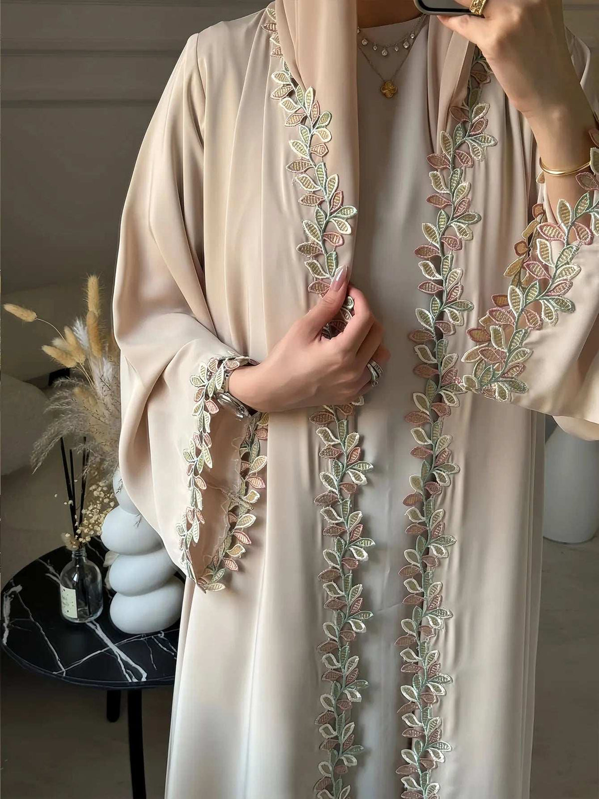 🌿 Stay effortlessly stylish with the Beige Harmony Embroidered Abaya. Adorned with multicolored leaf embroidery, this open abaya combines elegance and modesty, making it perfect for everyday wear or special gatherings. 🌸