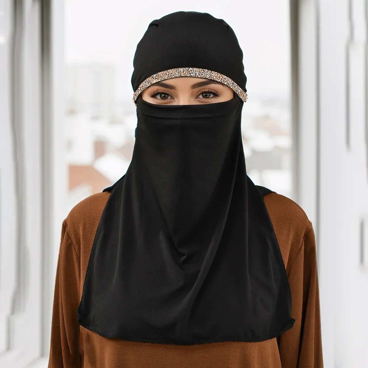 Adorn your modesty with our Rhinestone Chain Niqab. This full-coverage veil features elegant detailing for special occasions.