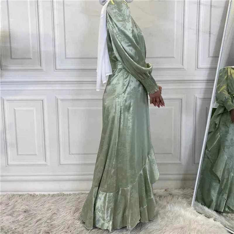 Celebrate in style with our Eid Satin Ruffle Abaya. Featuring delicate ruffles and a satin finish, this Moroccan-inspired kaftan is perfect for Ramadan, Eid, and special occasions.