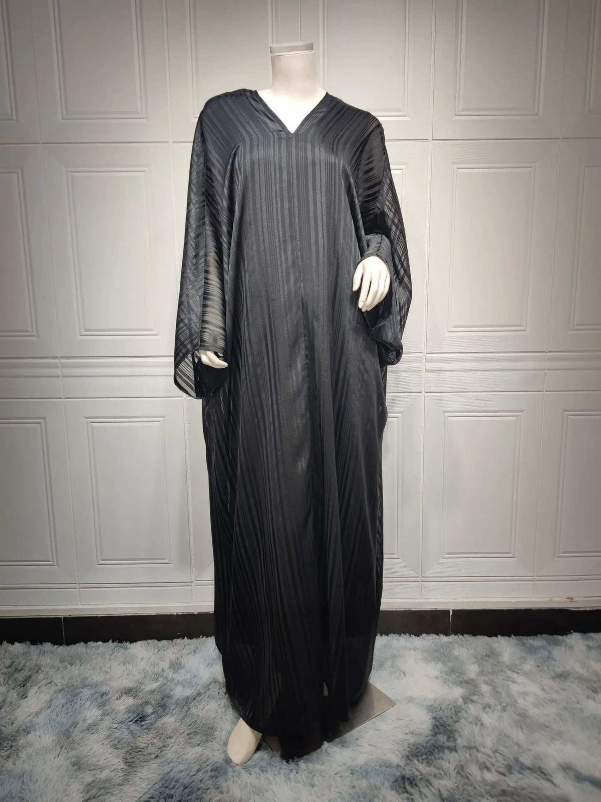 The Shiny Two-Piece Abaya Set is designed with a sparkling finish and batwing sleeves. This glamorous set is a perfect choice for parties, evening wear, and special occasions.